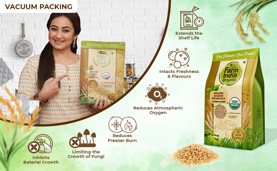 Everything that Farm India Organic packs are VACUUM PACKED to ensure that your grocery is free from germs and bacteria. It helps preserve all nutrients and gives you maximum health benefits from your grocery item. Also, it increases the shelf life of the grocery item.